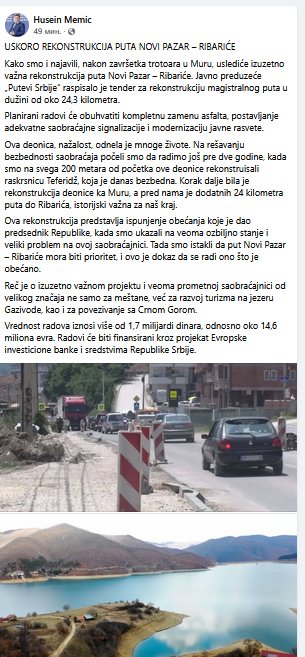 ”Kako smo i najavili, nakon završetka trotoara u Muru, uslediće izuzetno važna rekonstrukcija puta Novi Pazar – Ribariće. Javno preduzeće ”Putevi Srbije” raspisalo je tender za rekonstrukciju magistralnog puta u dužini od oko 24,3 kilometra.