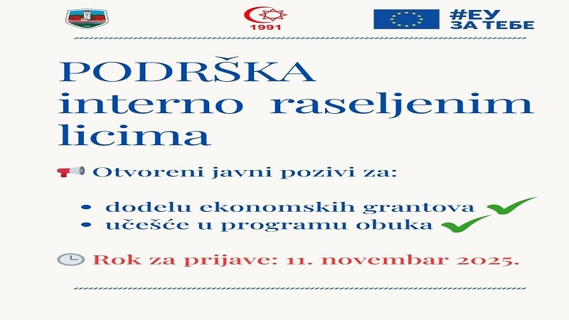Grad Novi Pazar, u saradnji sa MHD „Merhamet – Sandžak“, sprovodi projekat osnaživanja interno raseljenih lica sa Kosova i Metohije. U okviru projekta otvorena su dva javna poziva: za dodelu ekonomskih grantova interno raseljenim licima i za učešće u programu obuka namenjenih njihovom osnaživanju. Rok za podnošenje prijava je 11. novembar 2025.