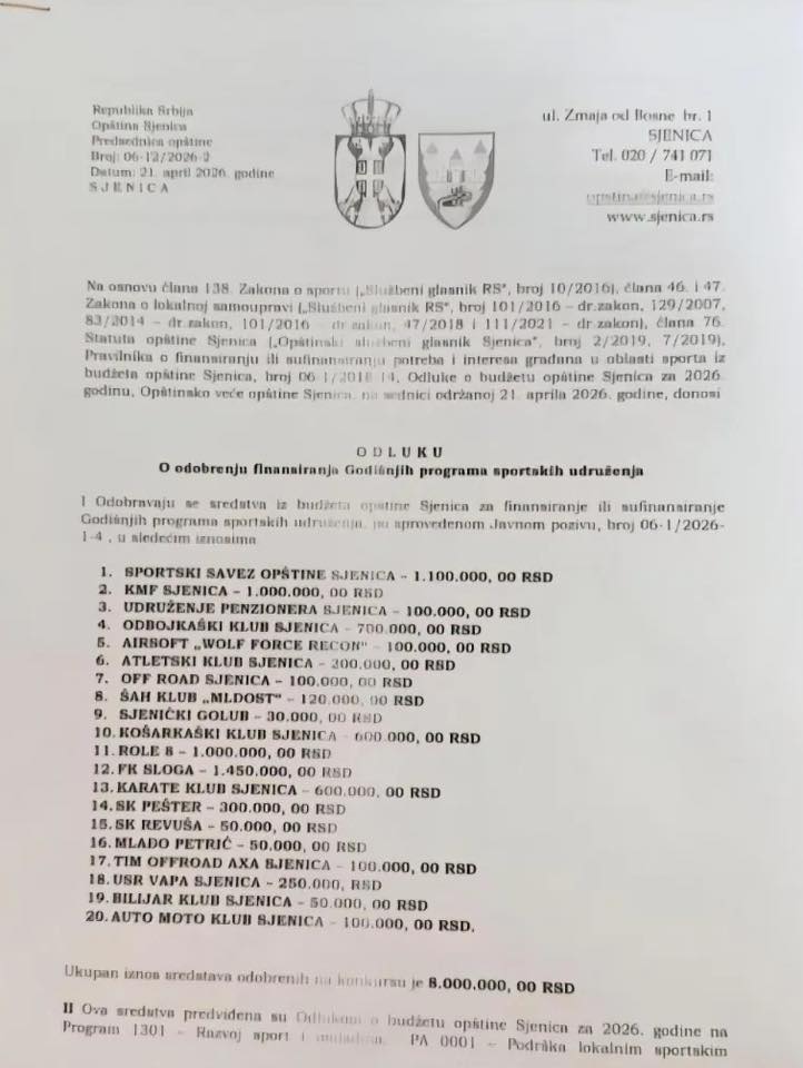Nakon što je u javnosti otvorena priča o teškom stanju u FK Sloga iz Sjenice, uslijedile su i prve reakcije koje su dodatno produbile dileme – da li klub zaista nema podršku ili je problem u realizaciji sredstava. Lokalni preduzetnik Emir Lakota oglasio se u komentarima, braneći lokalnu vlast i objavio dokument Opštine Sjenica u kojem se jasno vidi da je za FK Sloga za 2026. godinu opredijeljeno 1.450.000 dinara.