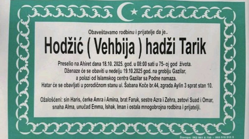 OpširnijeNa Ahiret je u 75.godini života preselio hadži Tarik Hodžić. Tarik Hodžić paralelno je završio Fakultet fizičke kulture (DIF)